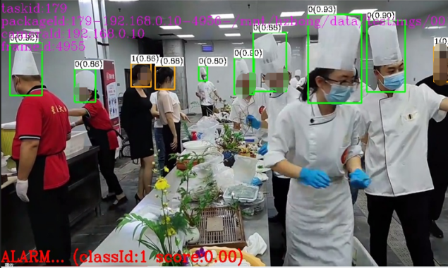 鯤云科技“算力+算法+平臺”一體化的AI視頻分析解決方案配備十余項專為明廚亮灶場景打造的AI算法,將后廚烹飪、清洗消毒等重點區(qū)域、重要環(huán)節(jié)的違規(guī)數(shù)據(jù)實時上傳到明廚亮灶監(jiān)管平臺,通過 AI 算法 7×24 小時智能識別抓拍后廚人員是否規(guī)范穿戴、鼠患活動、動火離人等情況,并提醒相關(guān)管理人員,形成 " 智能發(fā)現(xiàn) - 實時預(yù)警 - 閉環(huán)處置 " 的快捷響應(yīng)和管理鏈路。