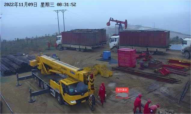 該項目采用邊緣端方案,部署鯤云AI視頻分析平臺,接入了現(xiàn)場的300路視頻,對油田生產(chǎn)過程中原油泄漏及漏油面積計算、安全帽檢測、紅色工作服識別、采油設(shè)備運行狀態(tài)識別、非法入侵等作業(yè)風(fēng)險及違規(guī)行為進行智能識別檢測,有效杜絕安全生產(chǎn)隱患。